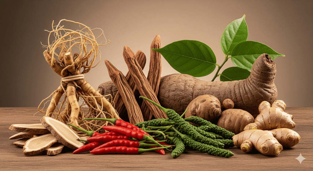 Akar purwaceng dikenal luas sebagai afrodisiak alami, bekerja dengan meningkatkan hormon testosteron, yang secara langsung berpengaruh pada gairah dan energi.